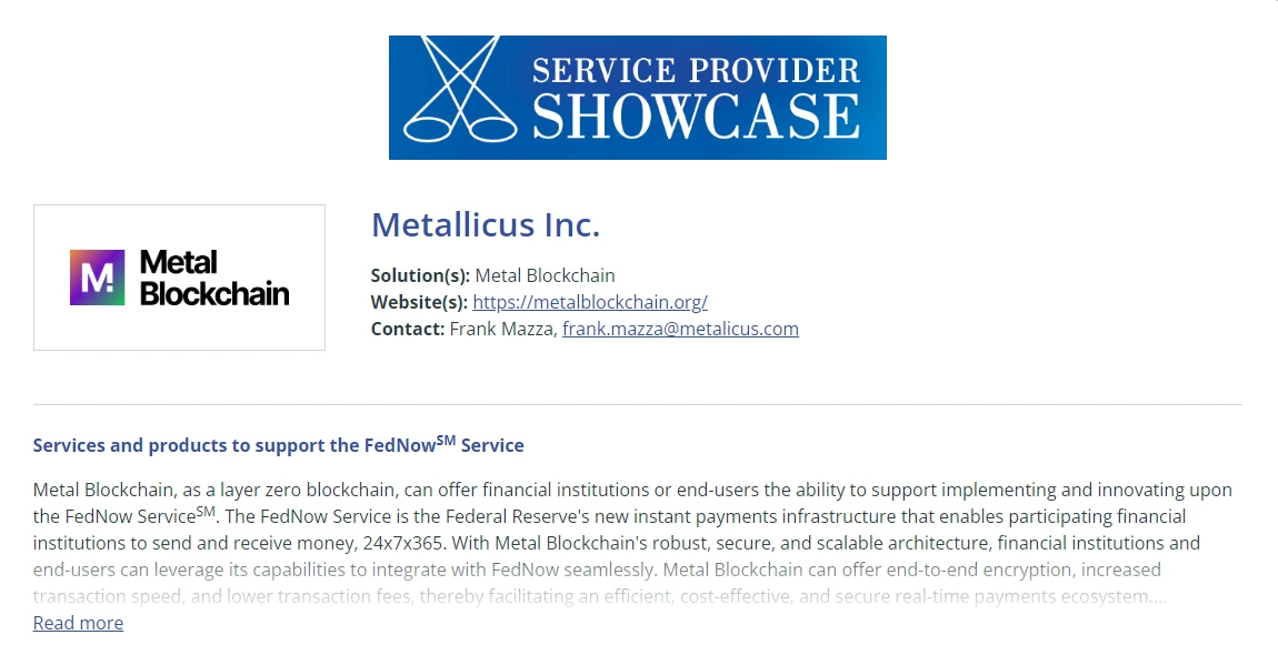 Листинг Metal Blockchain на витрине поставщика услуг FedNow. Источник: FedNow
