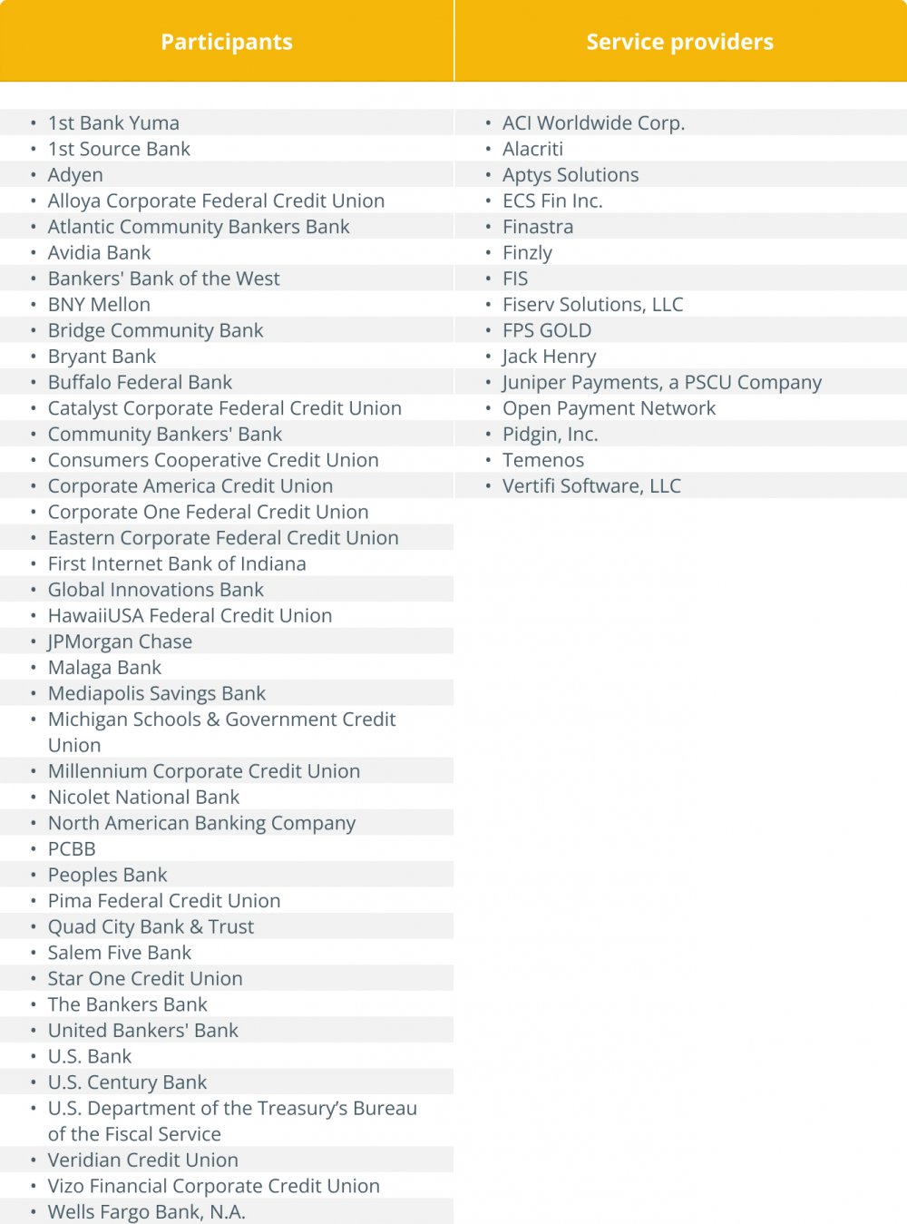 Федеральная резервная система сертифицировала службу FedNow как «готовую» после того, как к концу июля 2023 года она привлекла 41 финансовое учреждение, 15 поставщиков услуг и Министерство финансов США для тестирования системы перед ее запуском.