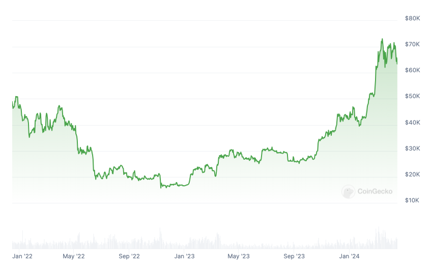 Цена биткоина (с января 2022 г. по январь 2024 г.). Источник: CoinGecko.