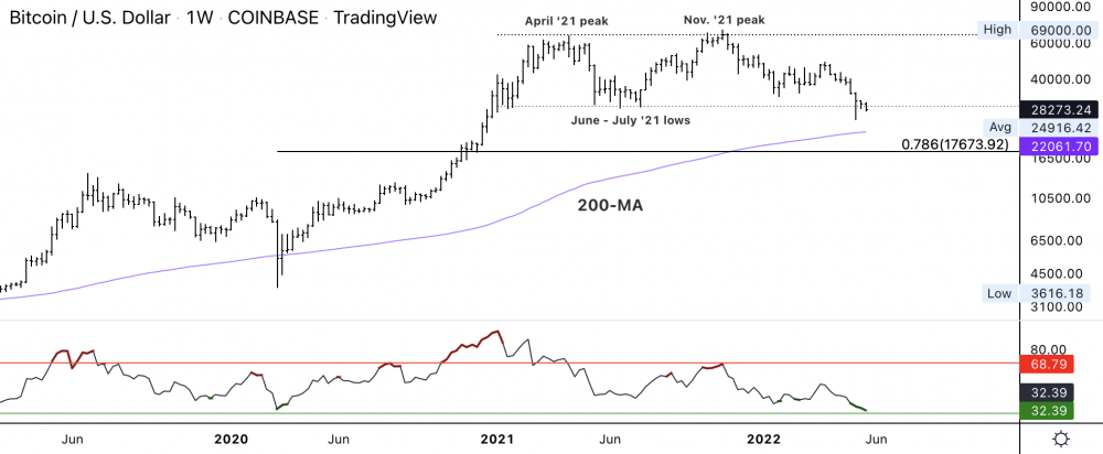 Более убедительной целью будет 17 673 долларов США, что составляет примерно 78% от предыдущего восходящего тренда с марта 2020 года по ноябрь 2021 года. Этот уровень цен также приведет к снижению примерно на 73% от пика до дна что может сигнализировать о капитуляции.
