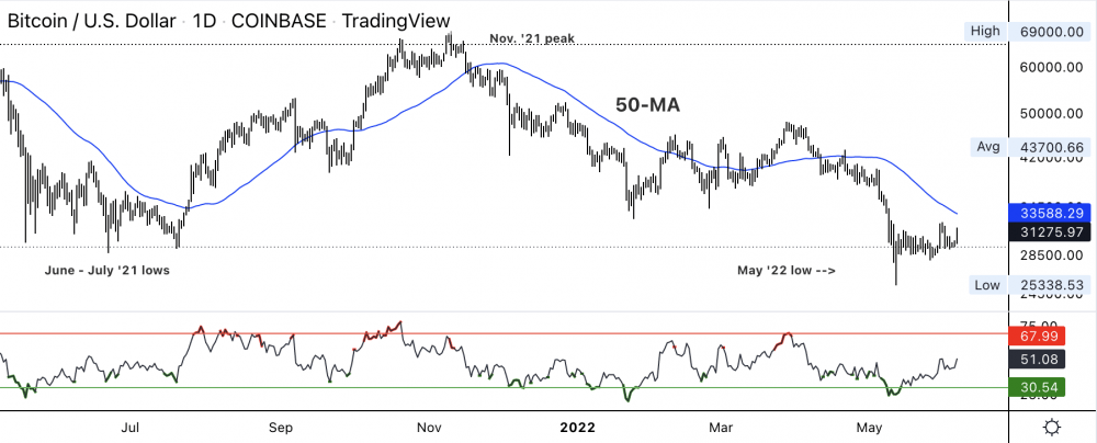 Недавний нисходящий тренд в цене стабилизировался выше минимума 12 мая на уровне 25 338 долларов США, что способствовало росту динамики на дневном графике. Например, 14-дневный индекс относительной силы (RSI) вернулся выше 50 нейтральной отметки в понедельник после достижения экстремальных уровней перепроданности 9 мая.