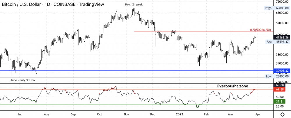 Индекс относительной силы (RSI) на дневном графике перекуплен впервые за пять месяцев, что означает, что продавцы могут вернуться в зоне сопротивления от 48 000 до 51 000 долларов США - 50% разворот предыдущего нисходящего тренда.