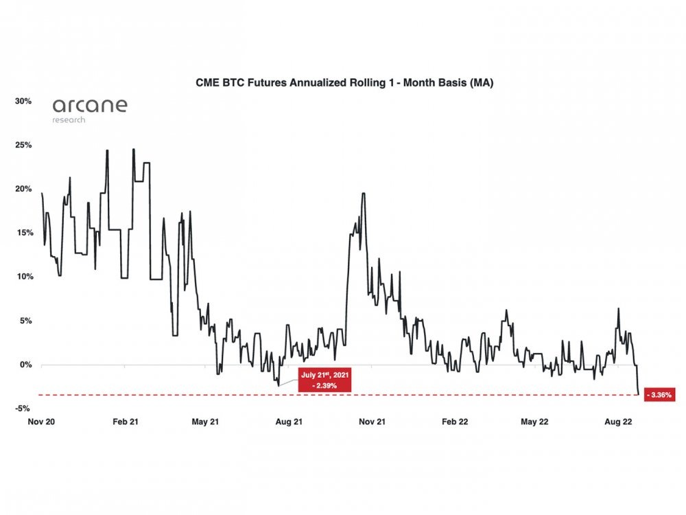 По данным Arcane, это превысило предыдущий минимум в минус 2,39%, установленный 21 июля 2021 года, за которым последовало сильное короткое сжатие. Фьючерсы CME торговались со скидкой в течение последних двух месяцев, но стали свидетелями недолгого восстановления в начале месяца, когда на рынке был некоторый импульс. В начале августа биткоин ненадолго достиг 25 000 долларов. Но 19 августа он упал ниже 21 000 долларов.