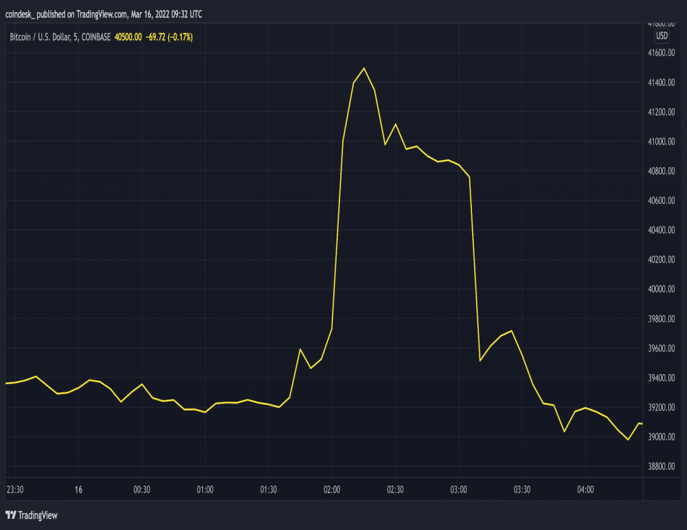 Биткоин подскочил с 39 120 долларов США до 41 700 долларов США внезапный рост, возможно, произошел из-за стоп-ордеров на шорт сделках и столкнулся с более сильным давлением продаж.
