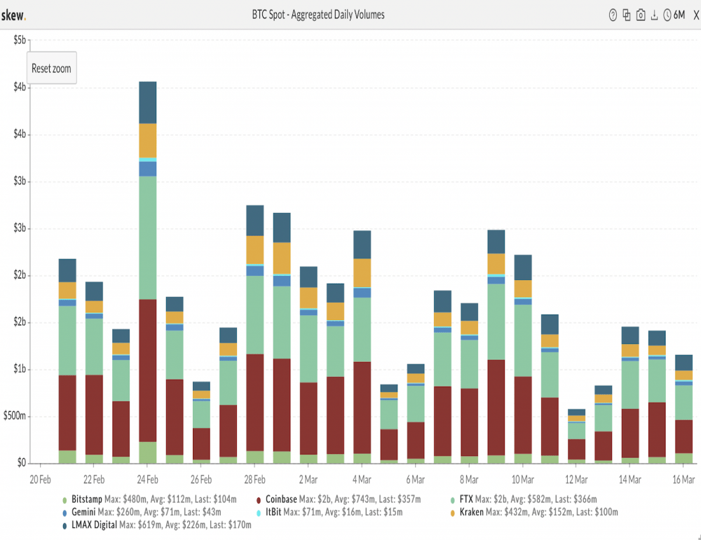 "В последнее время не хватало динамики как на спотовом, так и на деривативном рынках. Вчерашний объем спотовых торгов BTC составил чуть более 7 миллиардов долларов, в то время как объем бессрочных контрактных торгов составил всего около 40 миллиардов долларов", - сказал Гриффин Ардерн, трейдер волатильности из компании по управлению криптоактивами Blofin в чате Telegram.