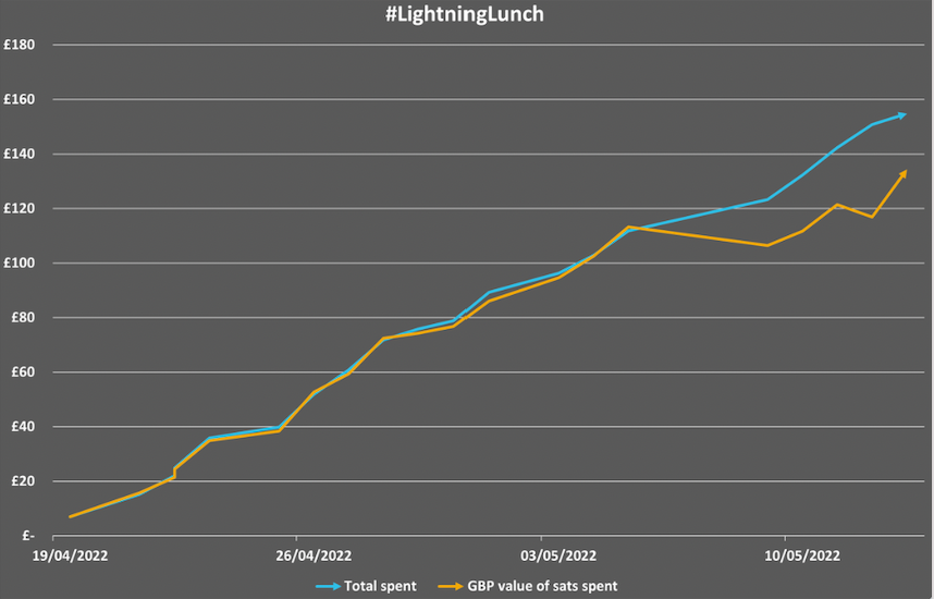 График MSW его Lightning Lunches. Стоимость потраченных сатошей (синие) выше, чем потраченных фунтов (желтые). Источник: Твиттер