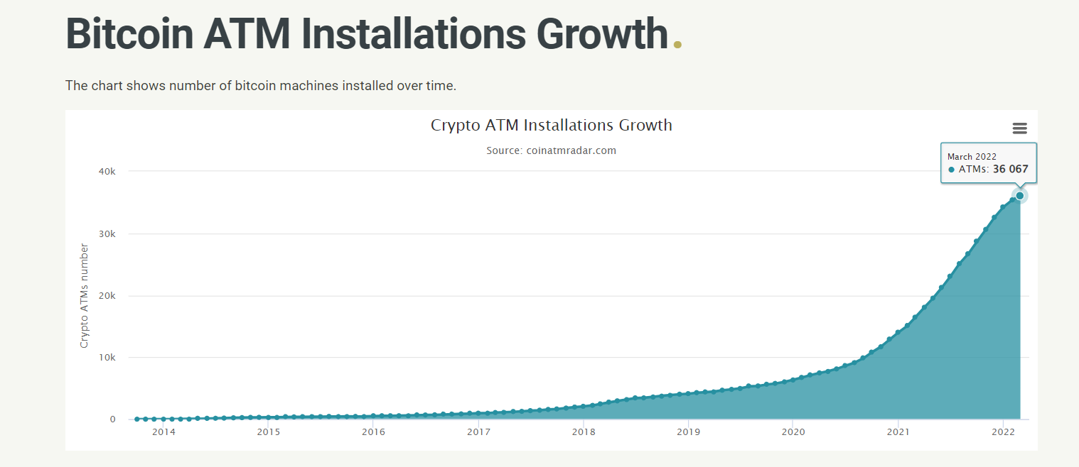 В настоящее время установлено 36 067 банкоматов. Несмотря на более медленное начало года, ожидается, что установки криптовалютных банкоматов будут расти, поскольку такие юрисдикции, как Сальвадор, планируют развернуть 1500 криптоматов.