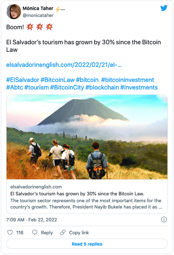 «Бум! Туризм в Сальвадоре вырос на 30% после принятия Закона о биткойнах. Мы планировали 800 000 долларов в иностранной валюте, но получили более 1 400 миллионов долларов дохода в иностранной валюте», - написала Вальдес в твиттере.
