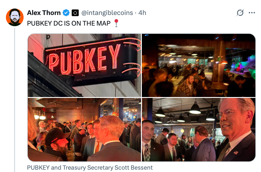 «То, что министр финансов пришел на открытие Pubkey в Вашингтоне, кажется тем событием, о котором позже можно будет сказать: „Ну как же мы сразу не поняли?“», — написал в публикации на X в четверг главный инвестиционный офицер казначейской компании Strive Бен Вёркман.