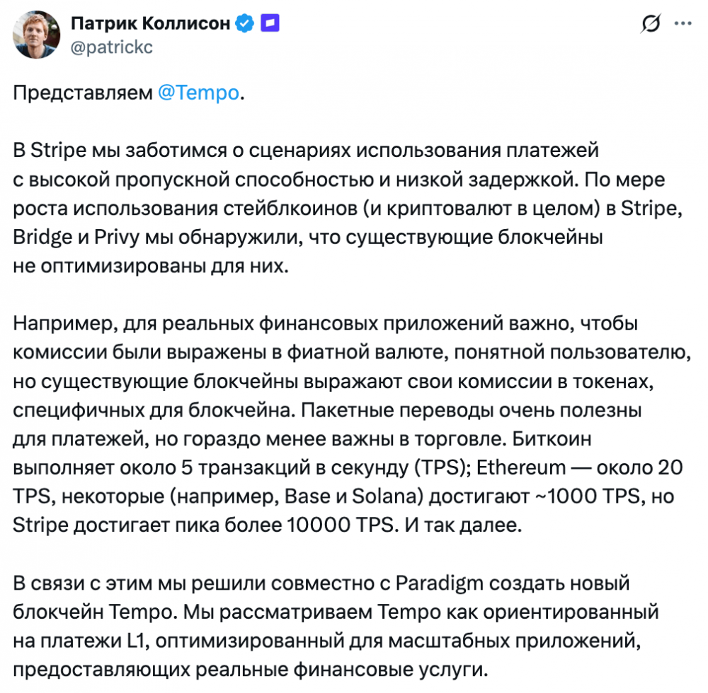 В то время генеральный директор Stripe Патрик Колисон описал Tempo как «независимую компанию, где Stripe и Paradigm стали первыми инвесторами».