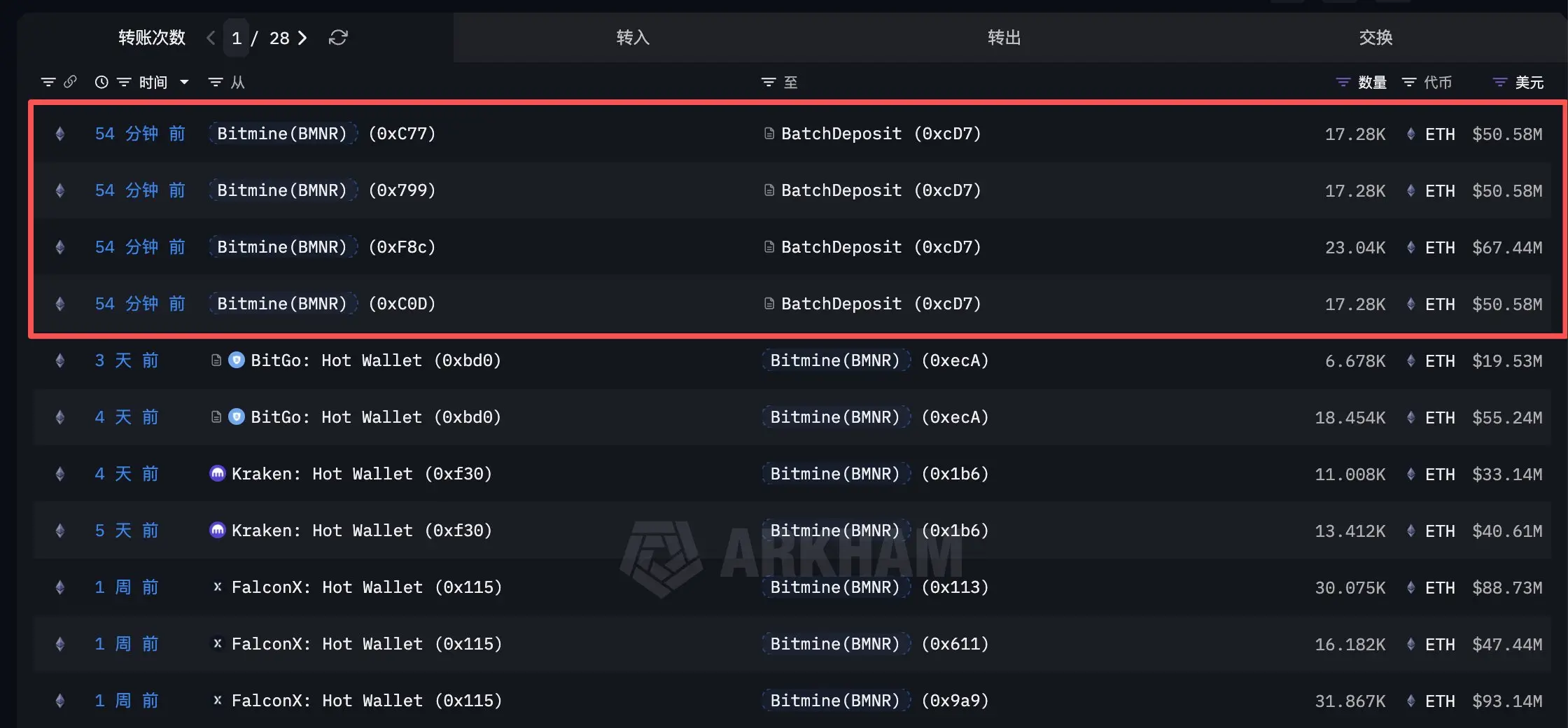 В воскресенье несколько кошельков, связанных с Bitmine, отправили суммарно 74 880 ETH на контракт с пометкой «BatchDeposit». Согласно данным Arkham, такая схема транзакций обычно связана с подготовкой институционального стекинга: средства аккумулируются перед созданием валидаторов.