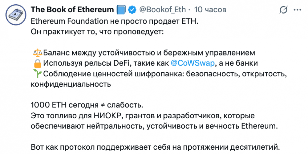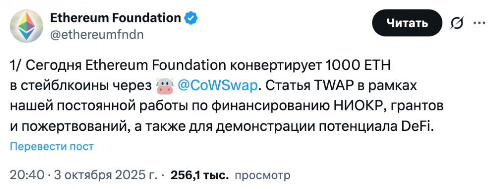 Эта операция стала следующей после заявления EF, опубликованного в сентябре. Тогда фонд сообщил о планах конвертировать 10 000 ETH в стейблкоины в течение нескольких недель. Однако пятничная транзакция, по всей видимости, не связана с этой инициативой, учитывая ее меньший масштаб и использование CoW Swap вместо централизованной биржи.