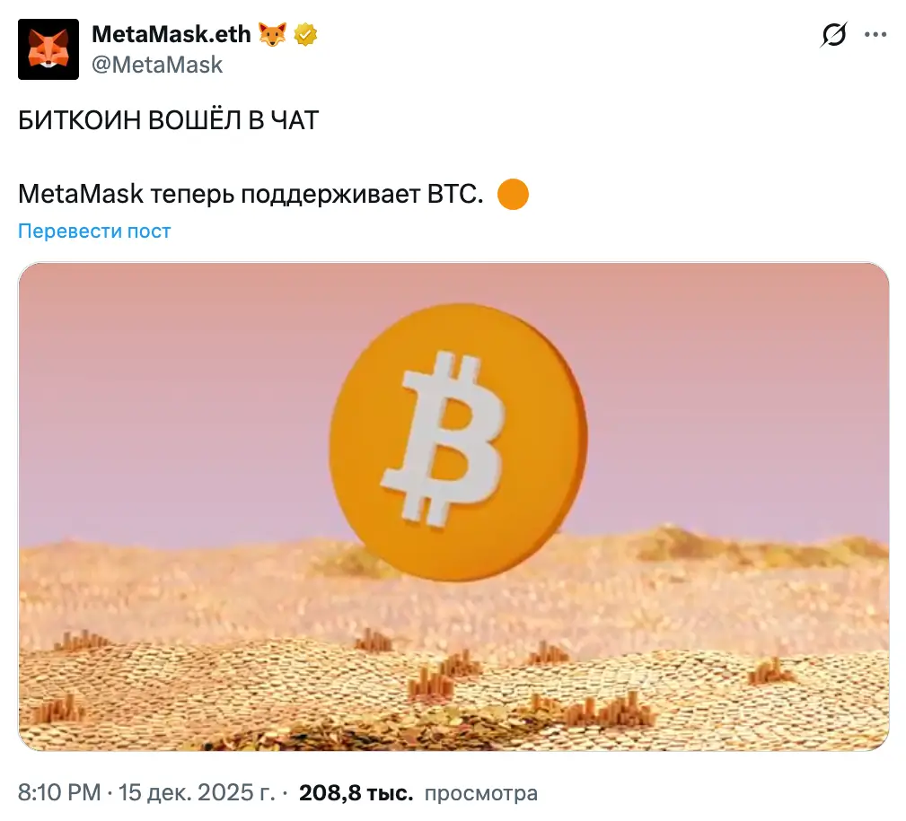 «Поддержка биткоина — это еще один шаг в нашем мультичейн‑расширении после запуска Monad и Sei в этом году. В 2026 году появятся и другие сети», — заявили в MetaMask.