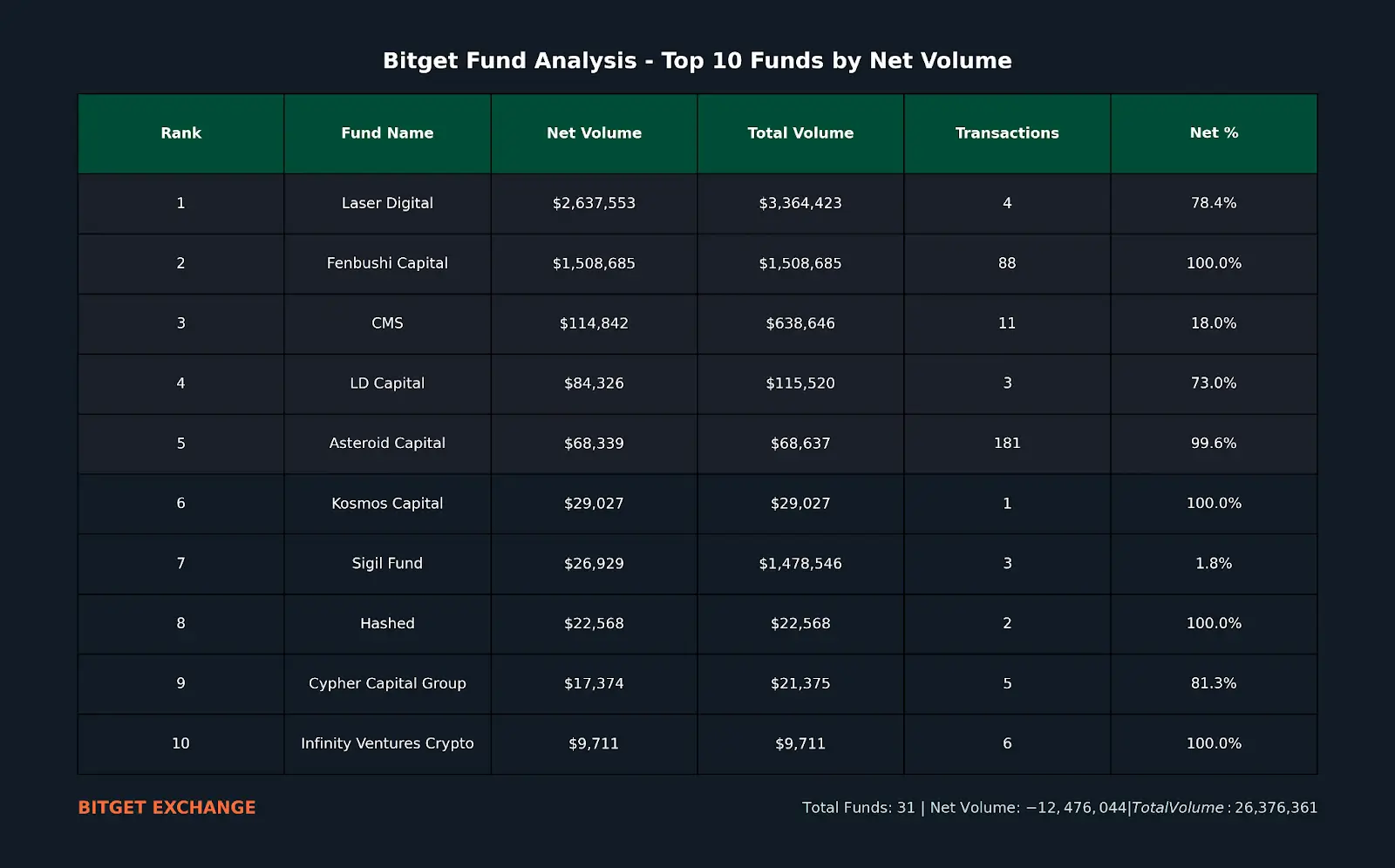 Согласно данным блокчейна от Nansen, основные институциональные потоки на Bitget обеспечили Laser Digital и Fenbushi Capital, на которые пришлась большая часть чистого притока средств на биржу.