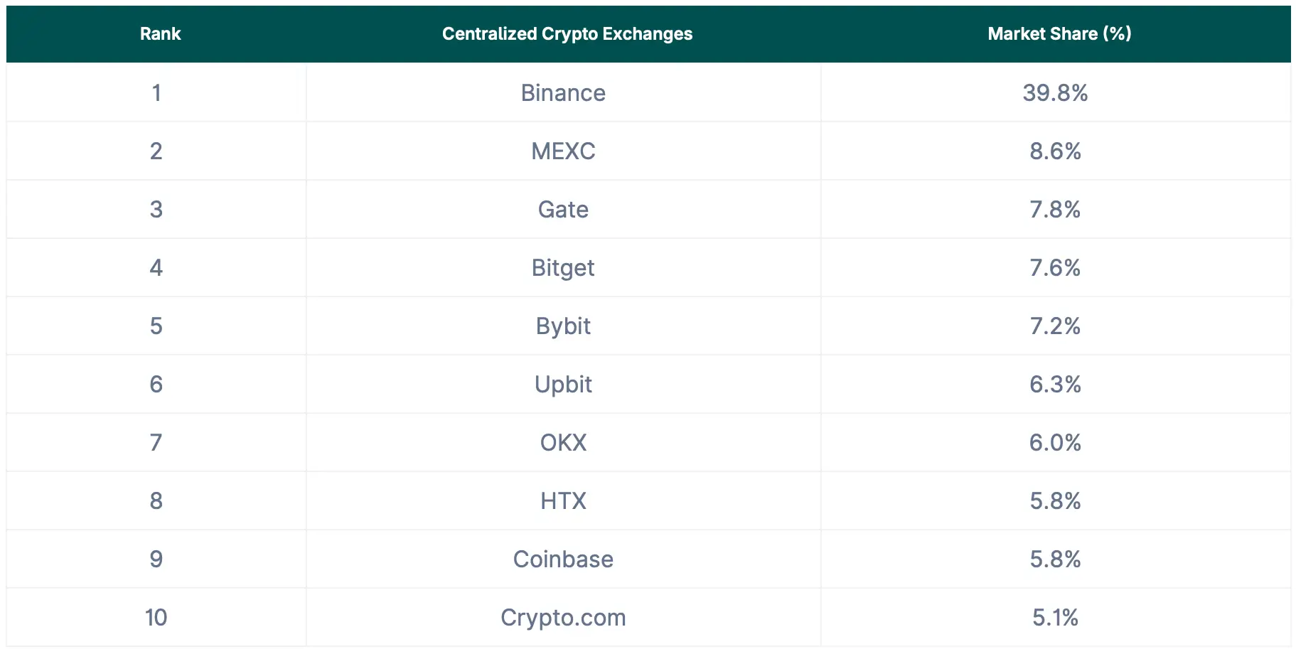 Топ-10 централизованных бирж по доле рынка, июль 2025 года. Источник: Coingecko