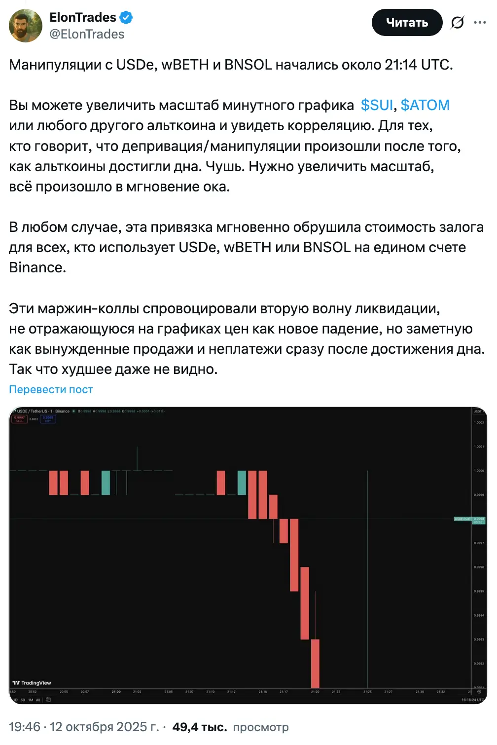 По его оценкам, это спровоцировало каскад ликвидаций на Binance на сумму до $1 млрд, которые затем распространились по всему рынку.