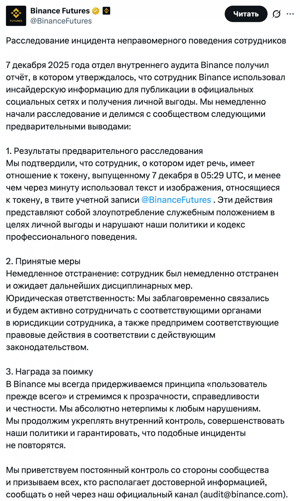 В сообщении Binance указано, что аудиторская группа получила отчет о том, что сотрудник использовал непубличную информацию для создания поста в официальном аккаунте Binance Futures в X. Пост был размещен менее чем через минуту после выпуска токена на блокчейне.