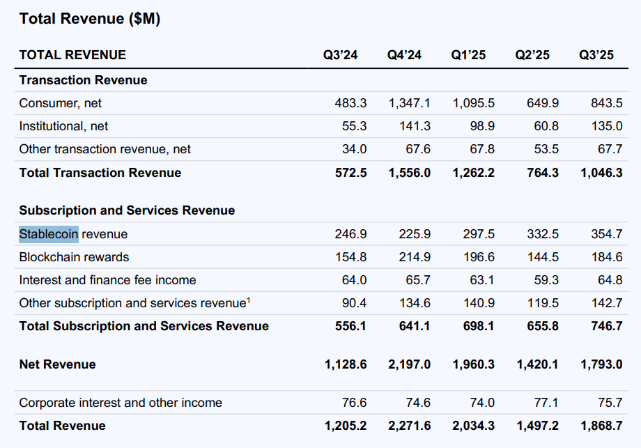 Однако около $246 млн, или 20% выручки Coinbase, поступило от операций со стейблкоинами в третьем квартале 2025 года, согласно отчету о прибылях и убытках биржи, опубликованному в четверг.