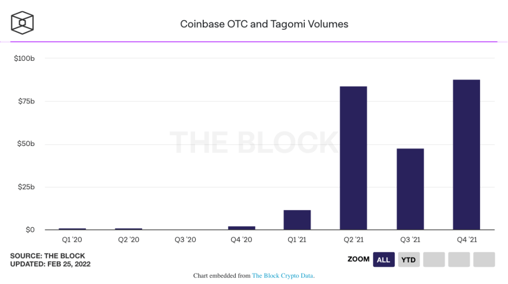 По словам представителя, разница представляет собой объемы, полученные Coinbase через институциональные торговые предложения: ее внебиржевой торговый отдел и основное брокерское подразделение Tagomi. В этом квартале он составил $88 млрд — рекордный показатель.