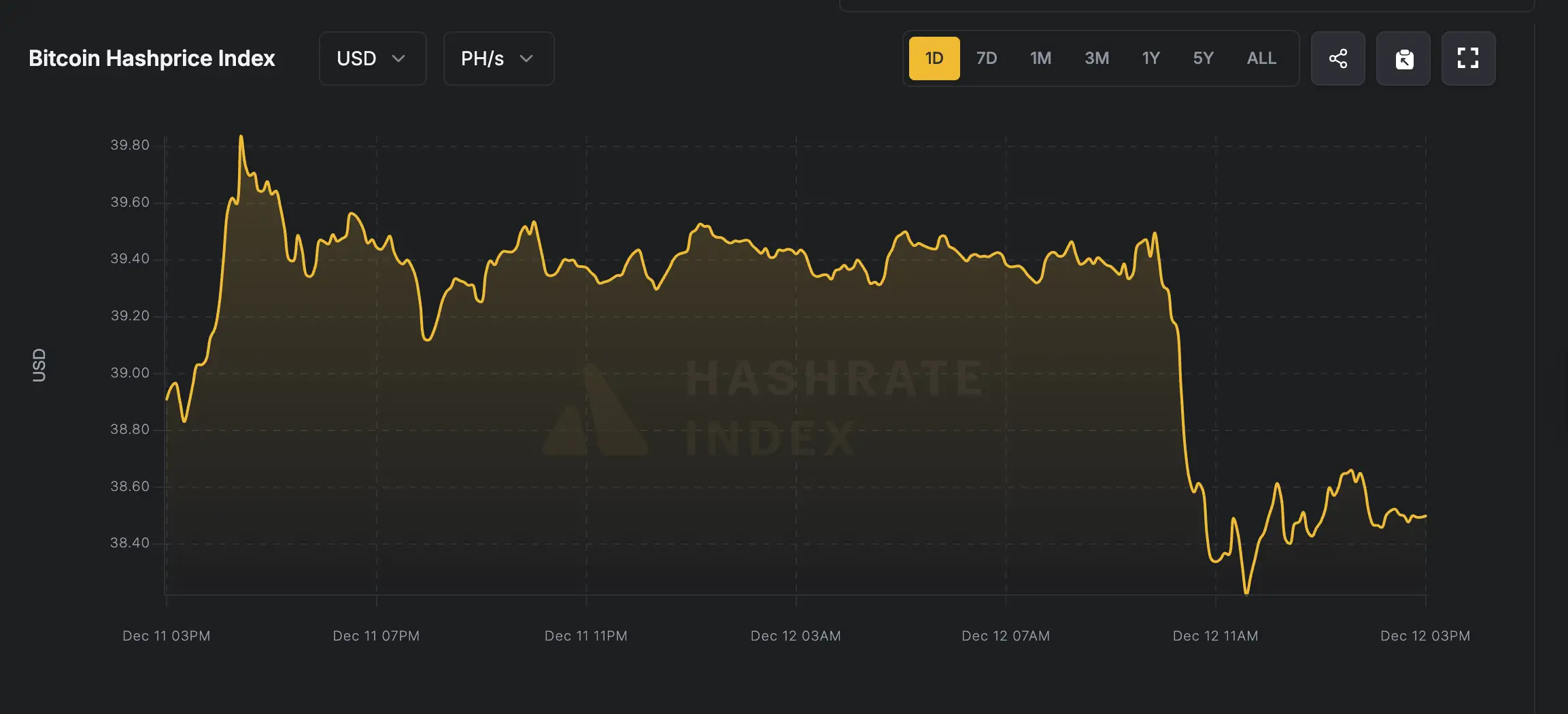 По данным поставщика майнинговой аналитики Hashrate Index, хэшпрайс — показатель ожидаемой прибыли майнера на единицу вычислительной мощности, затраченной на добавление блока, — на момент написания материала составляет около $39,4 за петахеш в секунду в день (PH/s/day).
