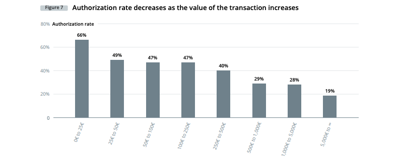 Кроме того, стоимость транзакции была основным показателем успеха: более мелкие транзакции на сумму от 0 до 26 долларов США достигли уровня авторизации 66% по сравнению с транзакциями на сумму более 5000 долларов США, которые обычно имеют уровень авторизации 19%.