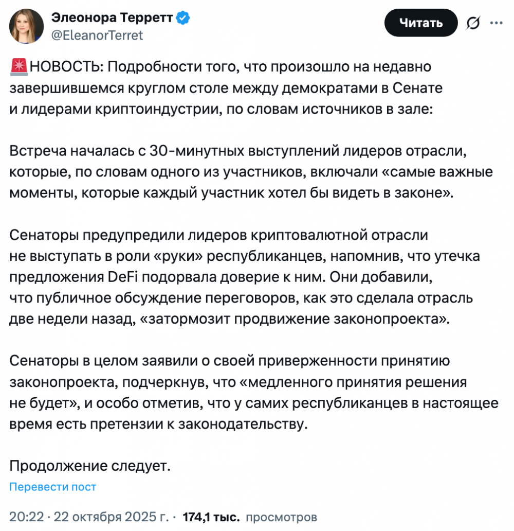 Напряженная встреча проходит на фоне четвертой недели приостановки работы правительства США. Это тормозит процесс принятия законопроекта о структуре рынка криптовалют и обеспечение ясности в регулировании отрасли.