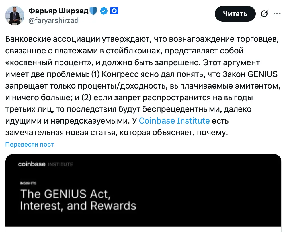 Банковские группы утверждают, что «косвенный процент» возникает, когда третья сторона получает финансовую выгоду и связана с эмитентом стейблкоина. Однако глава отдела политики Coinbase Фарьяр Ширзад решительно выступил против этой точки зрения в своем посте в X в четверг и призвал регуляторов «придерживаться текста закона».