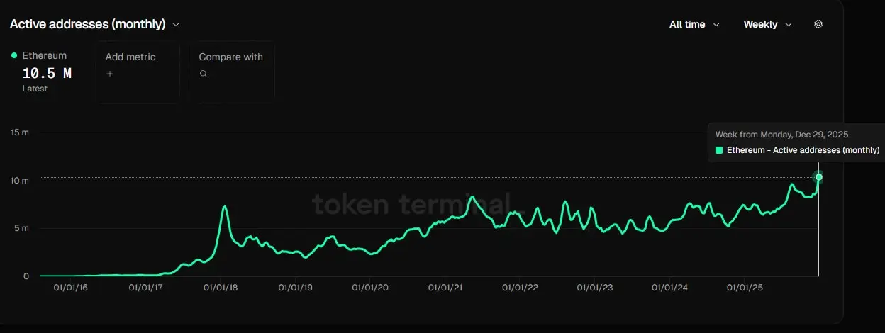 Token Terminal сообщает, что в декабре число активных ежемесячных адресов в сети Ethereum достигло исторического максимума — 10,4 млн.