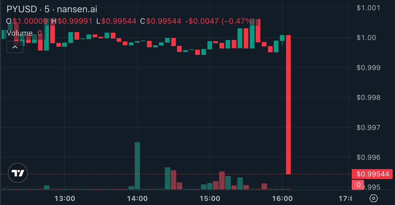 По данным Nansen, после выхода новостей PYUSD сохранила привязку к доллару, но ее цена ненадолго снизилась примерно на 0,5%.