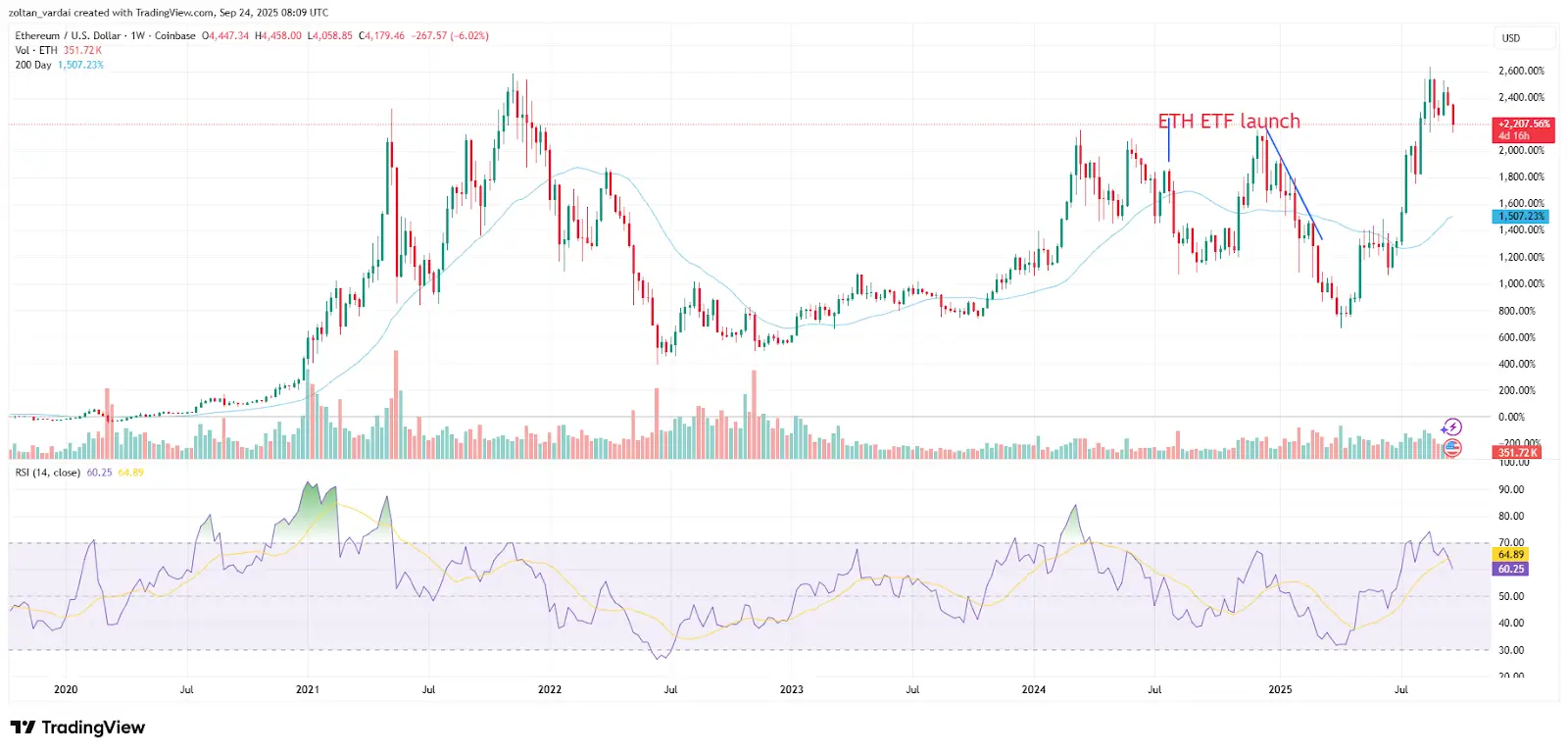 По данным TradingView, за последние шесть месяцев Ethereum вырос примерно на 108% и на момент написания статьи торговался на уровне $4177.