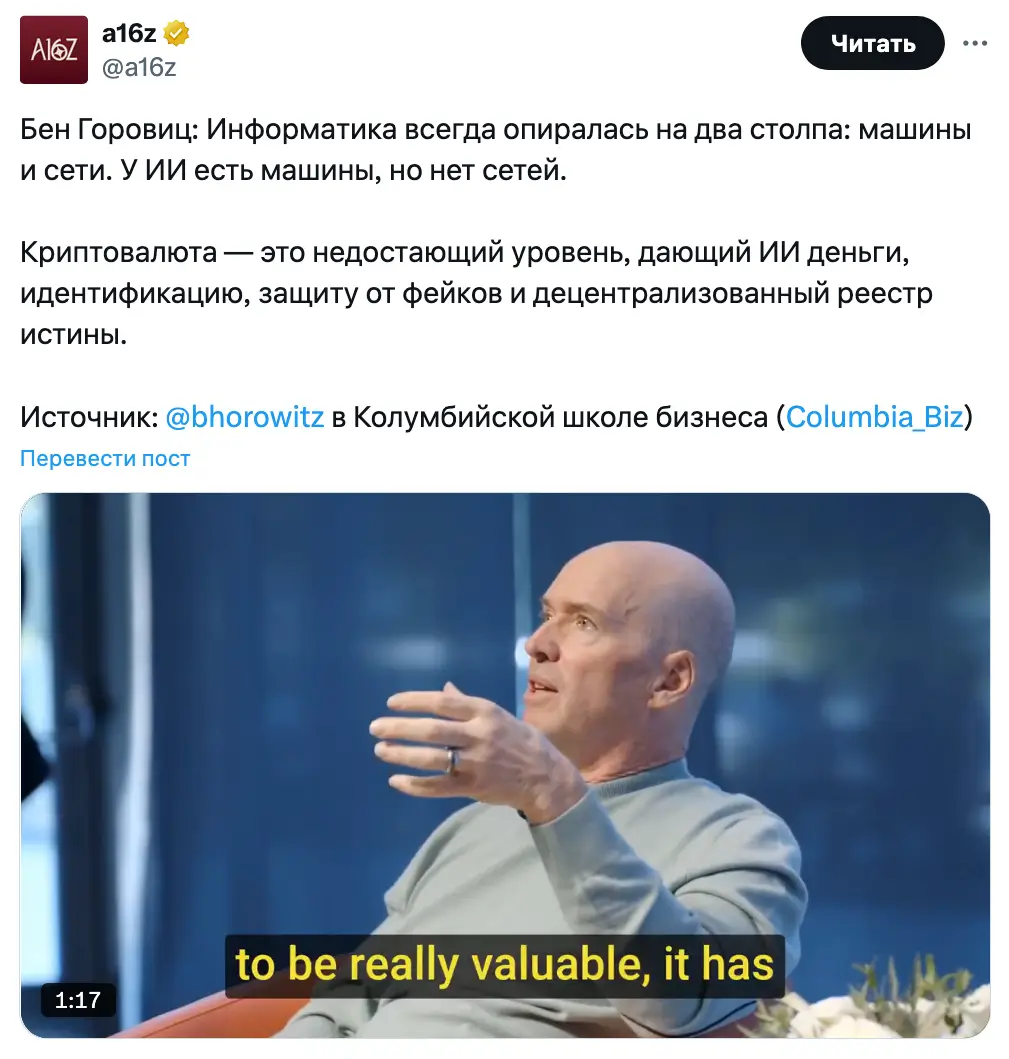 «Если вы ИИ, вам не разрешено иметь кредитную карту», — написал Хоровиц в публикации Tuesday X. «Криптовалюта — это своего рода экономическая сеть для ИИ», — добавил он.