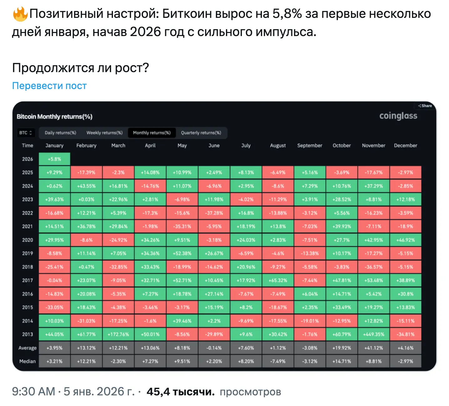По данным CoinGecko, в настоящий момент биткоин торгуется на уровне $93 750. Это на 25,6% ниже исторического максимума в $126 080, достигнутого 6 октября, но на 7,1% выше уровня начала 2026 года.