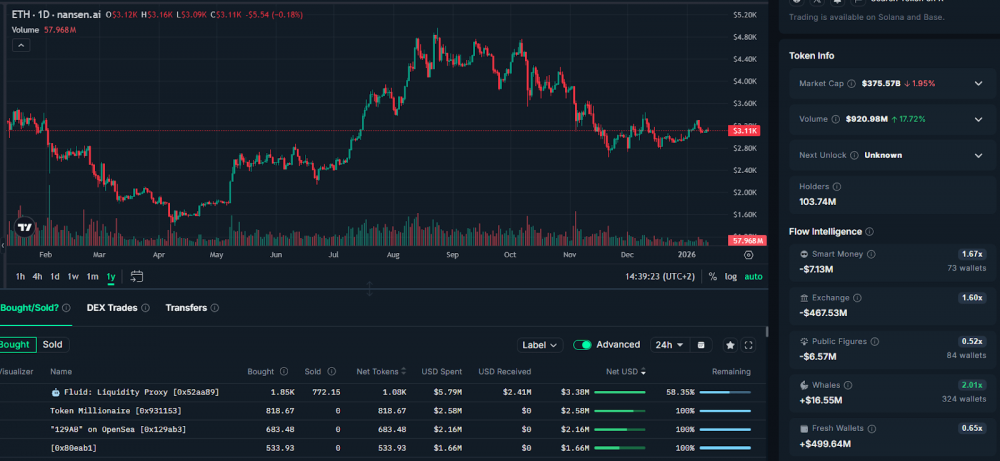 ETH/USD, годовой график, потоки токенов по группам. Источник: Nansen.