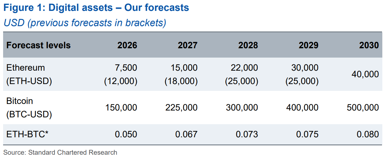 Согласно отчету, Standard Chartered снизил прогноз цены эфира на конец 2026 года до $7 500 — с прежних $12 000. Прогноз на конец 2028 года также понижен: с $25 000 до $22 000.
