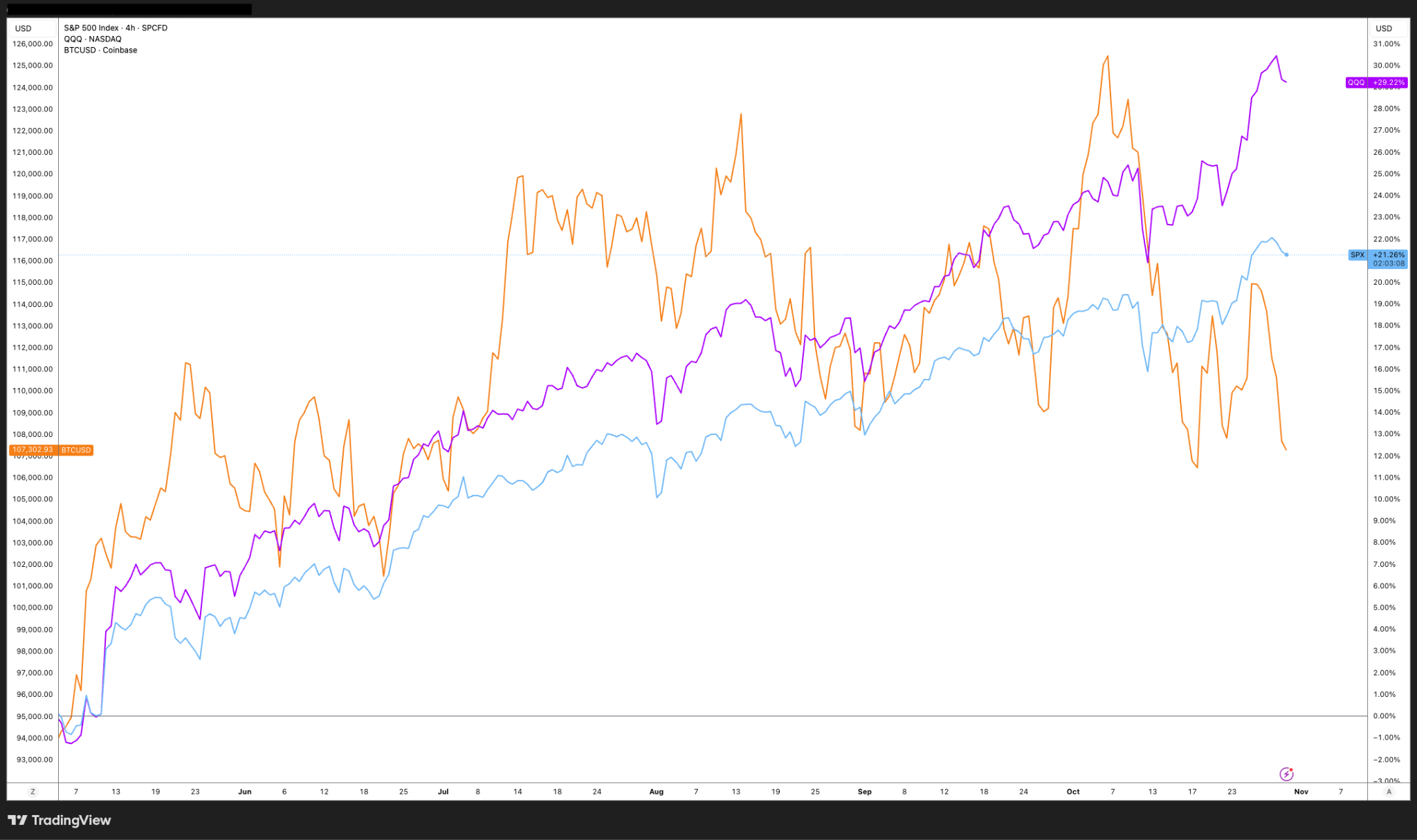 Рисунок 1. 4-часовой график BTC, SPX, QQQ. Источник: TradingView.