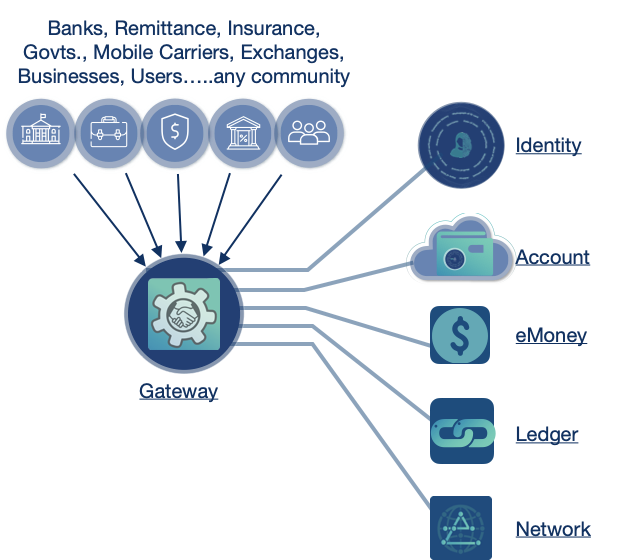 - Универсальный счет: Счет в облаке, в котором хранятся документы, идентификационные данные, доступ к банковским счетам, валютам и инвестиционным средствам. Кроме того, счет предоставляет доступ более чем 4 миллиардам пользователей, у которых нет смартфона и которые часто не подлежат банковскому обслуживанию; пользователь с пресловутой рубашкой на спине может посетить агента со смартфоном или банкоматом с камерой, сканировать свое лицо, ввести PIN-код, а затем получить доступ к своему счету, чтобы сделать вывод средств или внести депозит.