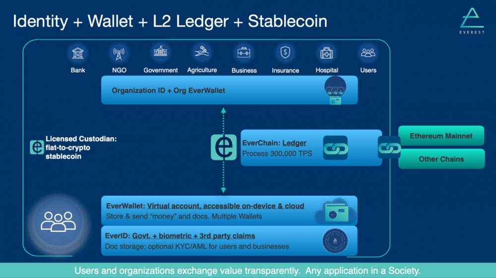 Everest сочетает в себе безопасную биометрию и технологии шифрования массового рынка для облегчения создания/проверки личности, создания учетной записи, а также отслеживания и проверки транзакций. С помощью любого смартфона пользователь или финансовое учреждение может захватить множество биометрических данных (например, лицо, ладонь, палец) и создать учетную запись — Everest достигает этого за считанные минуты и за копейки на клиента, по сравнению с днями и десятками долларов, как это необходимо традиционными финансовыми учреждениями (FI). Патентованная «датаграмма» прикрепления биометрии к кошельку ERC20 с соответствующим распределенным хранилищем для аутентификации и авторизации способствует истинному агентству для конечных пользователей; то есть никто не может открывать учетные записи пользователей, кроме самого пользователя. А благодаря сочетанию хранения токенизированных денег и документов с блокчейном пользователи могут детально делиться аттестациями, атрибутами, оцифрованными деньгами и прочим в свободное время. Кроме того, будучи регулируемым хранителем с возможностью выпуска собственного стейблкоина и используя невероятно масштабируемую бухгалтерскую книгу (300 000 транзакций в секунду; считаясь «сверкапой» в основную сеть Ethereum), Everest позиционируется для вывода DeFi на массовый рынок.