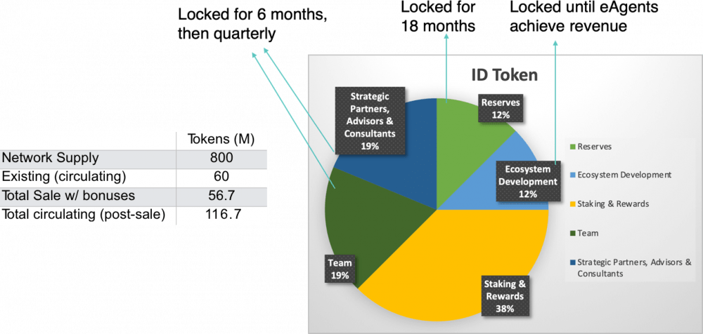 Общий объем идентификационных токенов составляет 800 миллионов. ID-токен является виртуальным финансовым активом/токеном (функциональность утилиты, согласно юридическим заключениям в Европе, с наличием в более чем 170 странах), предоставляющим держателям вознаграждения, права голоса и управления, а также обеспечивающим доступ к сети и множеству приложений и услуг, доступных в экономике. Команда и стратегические партнеры, консультанты заблокированы на шесть месяцев. Резервы заблокированы на 18 месяцев. Разработка экосистемы заблокирована до тех пор, пока eAgents и eTellers не приведут соответствующий доход.