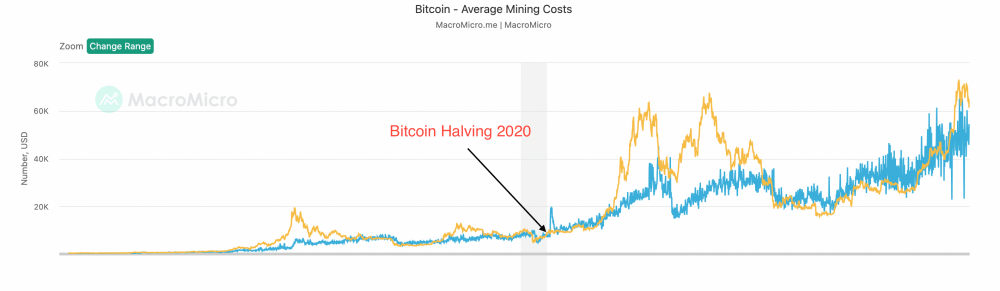 Например, после третьего халвинга в мае 2020 года средняя стоимость добычи одного BTC выросла, как показано синей волной на графике ниже. Рост операционных издержек вытеснил с рынка более мелких игроков, что потенциально усилило централизацию сети.