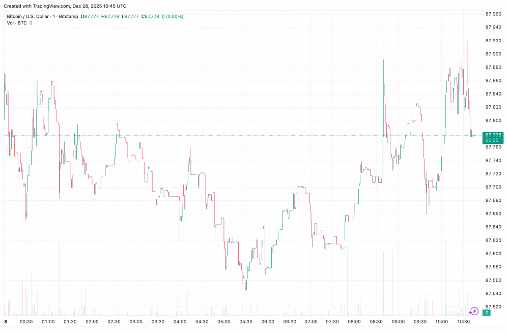 После снижения в начале сессии цена нашла поддержку около 87 500 долларов, прежде чем отскочить к верхней границе диапазона около 87 900 долларов. Каждая попытка продвинуться выше встречала сопротивление продаж, а коррекции были относительно неглубокими, что соответствует модели консолидации в условиях низкой ликвидности в выходные дни.