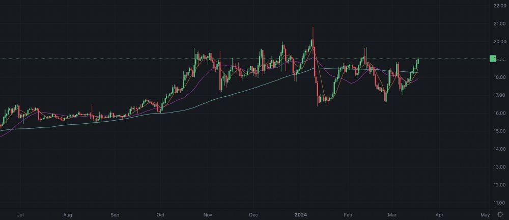 Дневной график BTC/ETH по состоянию на 18 марта 2024 года, когда один биткоин стоил около 19 эфиров. Источник: Binance.