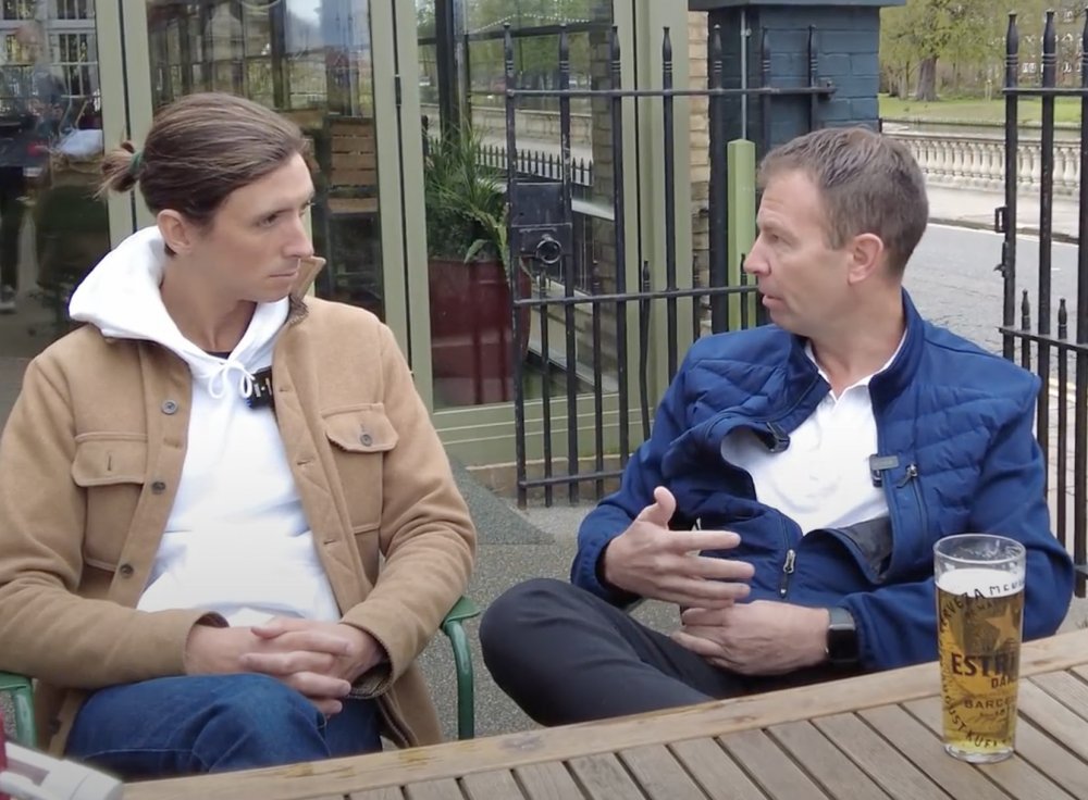 Джефф Бут (справа) разговаривает с журналистом Джо Холлом.