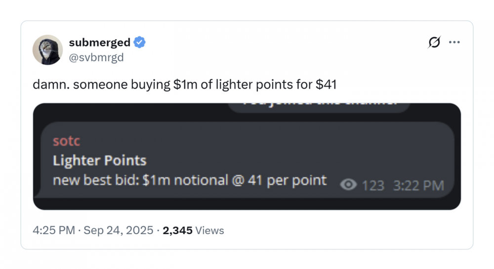 Хотя токена еще нет, уже существует оживленный внебиржевой рынок баллов Lighter, где баллы продаются по цене в десятки долларов за штуку. Цены выросли с 39 до более чем 60 долларов, а один трейдер, как сообщается, потратил 1 000 000 долларов на покупку баллов по 41 доллару за штуку.