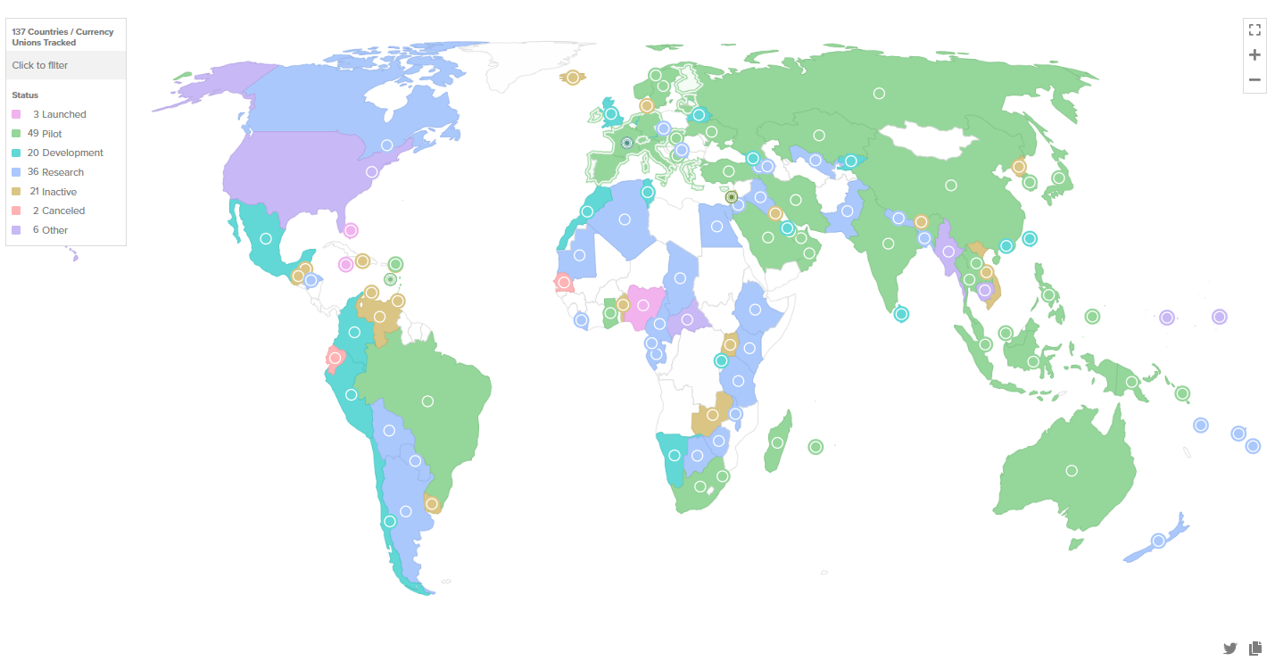 Рисунок 2. Три страны запустили CBDC, а в 105 странах CBDC находятся на стадии разработки, исследования или пилотного запуска. Источник: Atlantic Council.