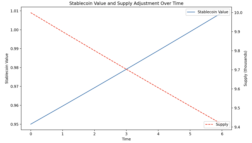Рисунок 10: Теоретический пример того, как алгоритмический стейблкоин сжигает предложение, чтобы вернуться к привязке. Источник: Grayscale Research, только для иллюстративных целей.