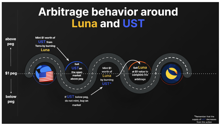 В основе отношений Luna и UST лежала арбитражная возможность, которая появлялась каждый раз, когда UST отклонялся от своей привязки. Когда предложение UST было низким, а спрос высоким, его цена превышала 1 доллар, например, 1,01 доллара. Чтобы вернуть UST к своей привязке, Terra разрешила пользователям сжечь 1 доллар США Luna и отчеканить 1 UST, который можно было продать за 1,01 доллара, обеспечив прибыль в 1 цент. Пользователи могли создавать столько UST, сколько необходимо, сжигая Luna до тех пор, пока UST не вернется к 1 доллару.