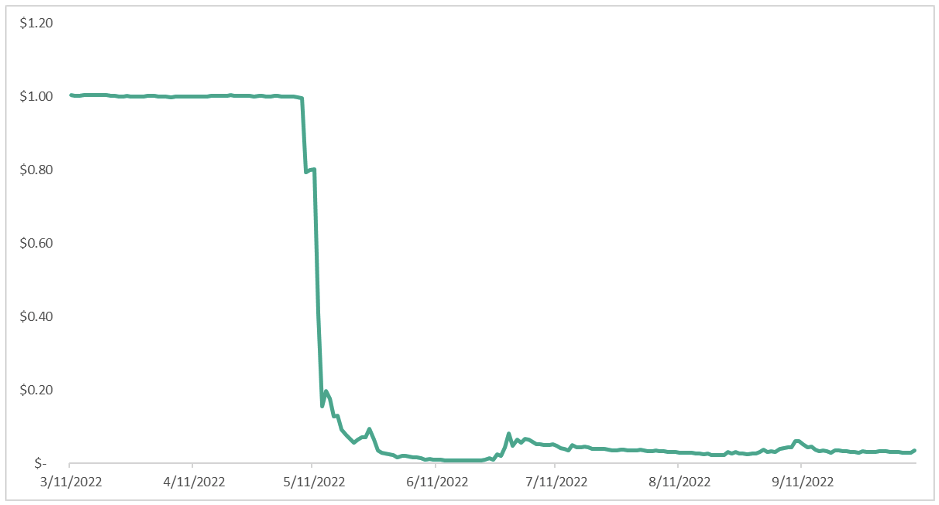 В конечном итоге сочетание рыночных и механических сил положило конец проекту Terra. Цена UST резко упала в мае 2022 года, когда сочетание бегства капитала UST, дисбаланса пула ликвидности и оттока пользователей протокола Terra DeFi резко снизило цену UST (рис. 11). В частности, когда UST торговался ниже своей привязки в 1 доллар, пользователи воспользовались возможностью купить UST со скидкой, затем обменяли его на Luna стоимостью 1 доллар с небольшой прибылью, а затем продали свои активы Luna. Эта активность создала давление со стороны продавцов как на UST, так и на Luna.