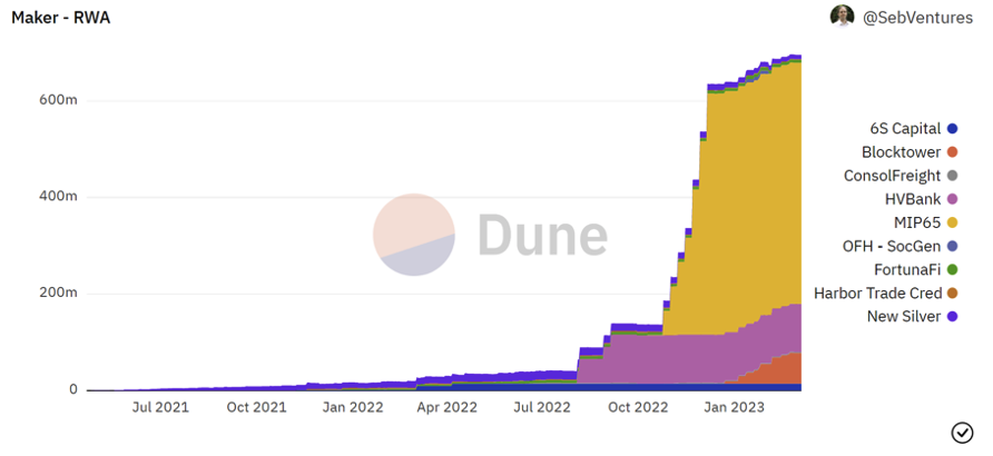Рисунок 12: Активы MakerDAO в RWA. Источник: Dune, @SebVentures, по состоянию на 09.03.2023.