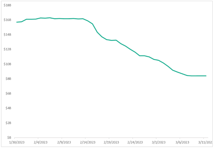 Судя по всему, за последнее время регулирующее внимание, сосредоточено на централизованных стейблкоинах. Например, Департамент финансовых услуг Нью-Йорка (NYDFS) недавно объявил о принятии мер против Paxos Trust (Paxos), эмитента стейблкоинов с белой этикеткой, приказав им прекратить выпуск централизованного стейблкоина Binance USD (BUSD). BUSD был впервые выпущен в 2019 году в рамках партнерства между Paxos и биржей криптовалют Binance, и в ноябре 2022 года его рыночная капитализация достигла 23 миллиардов долларов. Клиенты Binance и Paxos выпустили BUSD, чтобы предотвратить использование платформы злоумышленниками». Более того, Комиссия по ценным бумагам и биржам (SEC) выпустила для Paxos уведомление Wells («Уведомление Wells» - это корреспонденция, которую отправляет SEC, информируя получателя об обвинениях, которые она планирует выдвинуть против него, и дает получателю возможность исправить свое поведение и дать письменный ответ), в котором утверждалось, что BUSD является ценной бумагой. С момента объявления в начале февраля 2023 года рыночная капитализация BUSD упала почти на 50% (по состоянию на 07.03.2023), с ~16 млрд долларов до ~8 млрд долларов (рис. 13). Хотя это не влияет напрямую на другие централизованные стейблкоины, оно показывает, в какой степени централизованные эмитенты стейблкоинов подвержены действиям регулирующих органов.