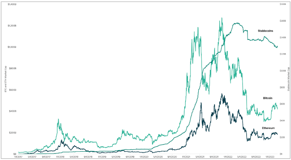 Рисунок 1: Рыночная капитализация стейблкоина по сравнению с рыночной капитализацией биткоина и эфириума. Источник: Coinmetrics, Grayscale Research, рыночная капитализация стейблкоинов включает USDT, USDC, BUSD, DAI, GUSD, HUSD, PAX, SAI, TUSD и USDK, данные по состоянию на 09.03.23.